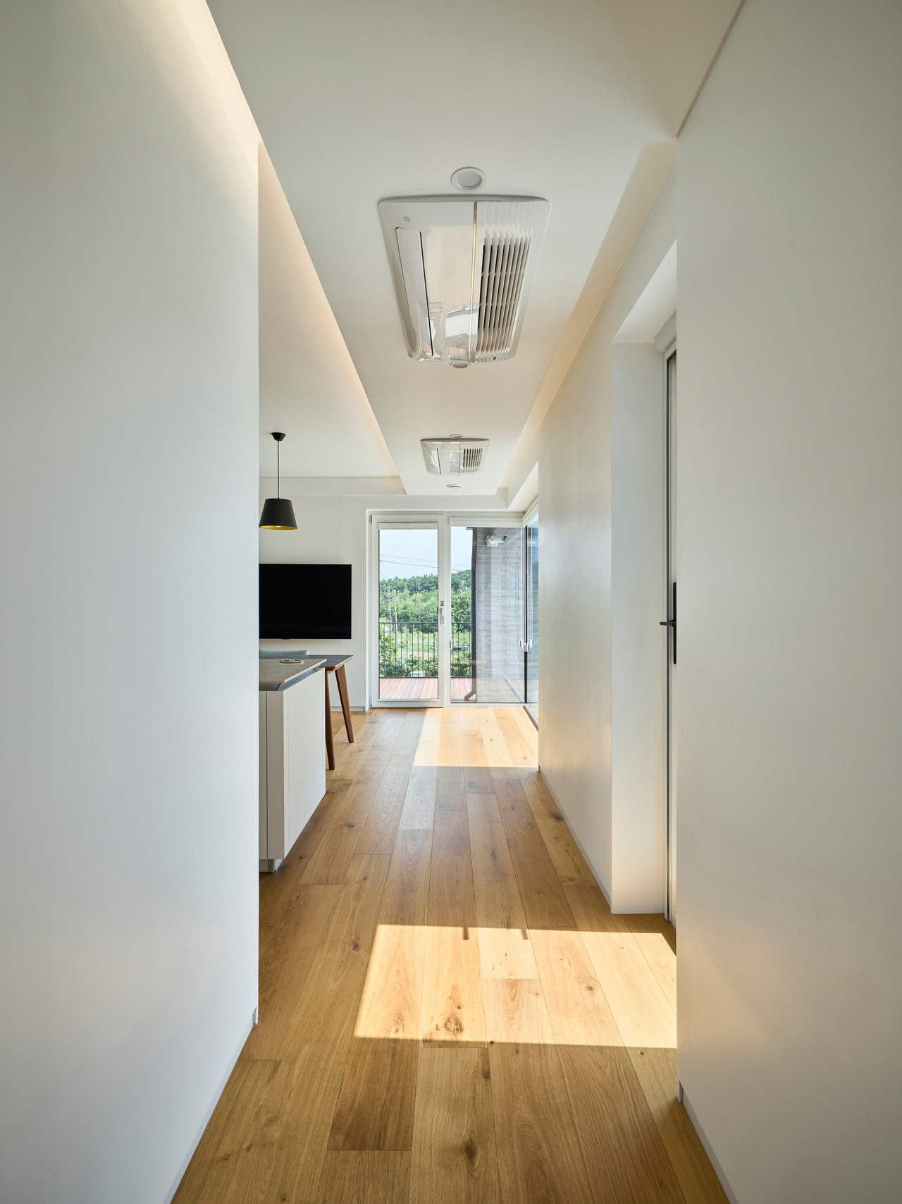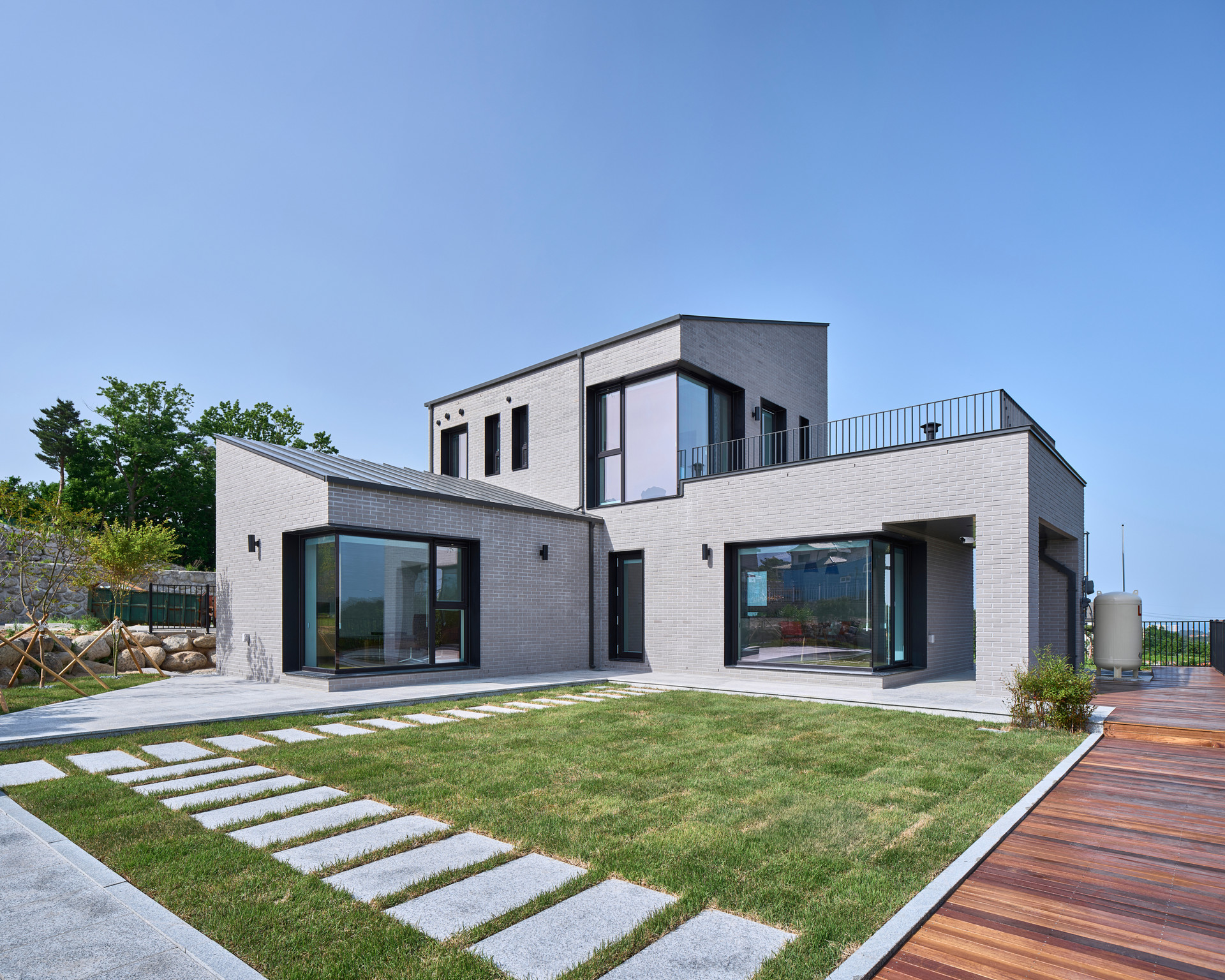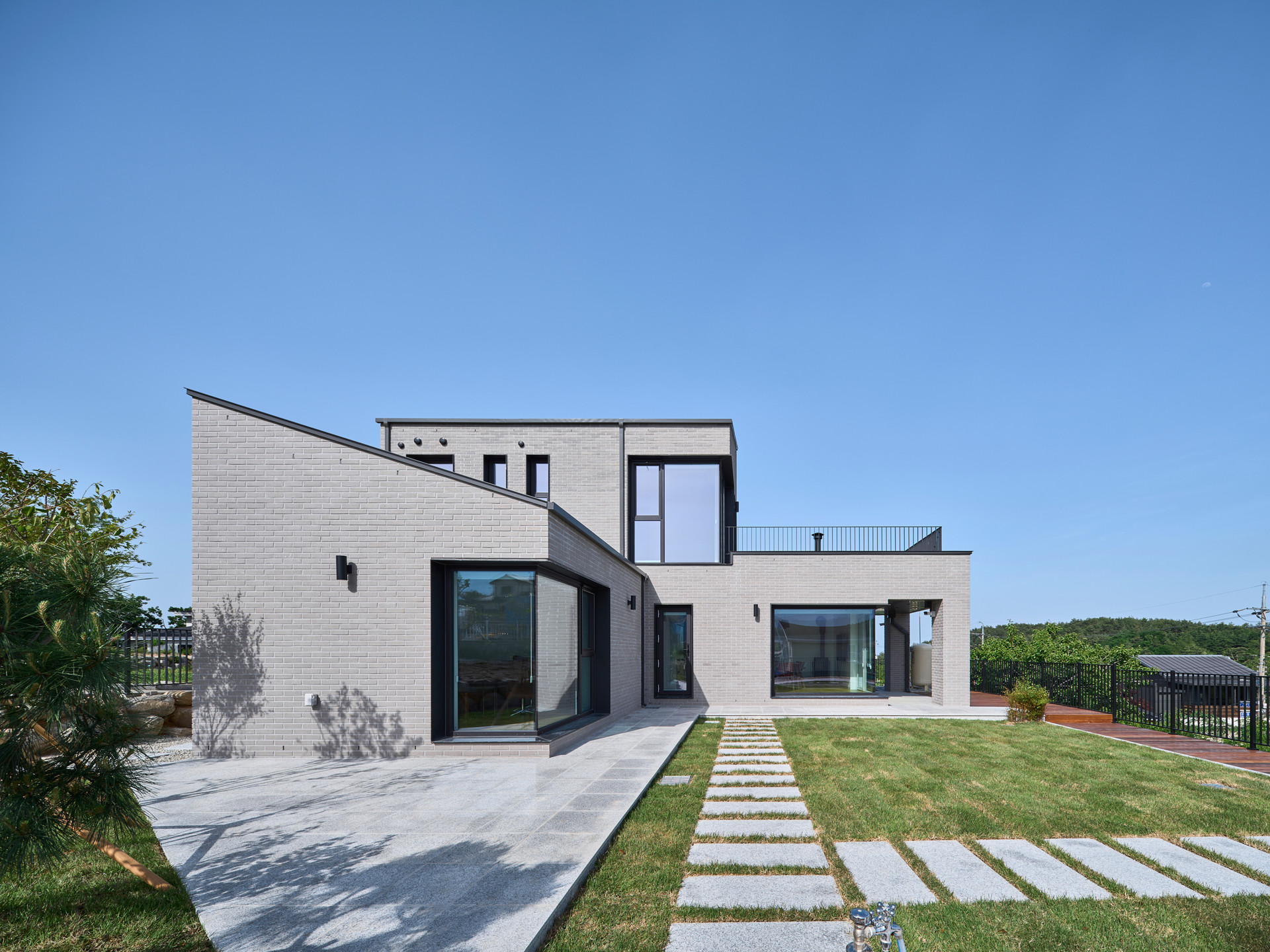 조망과 프라이버시. 이 상반된 요구사항에 대응하기 위해 대지의 조망, 프라이버시, 진입동선 등을 고려하여 ㄴ자 형태로 북측 도로에는 건물로 마주하고 남서쪽의 설악산 조망을 향해 열리는 배치로 마당을 안으며 자리 잡았다.